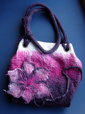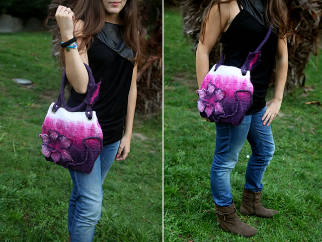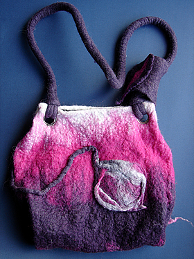 > Material: lã merino beringela, rosa e branco. Interior forrado com tecido cinza.
